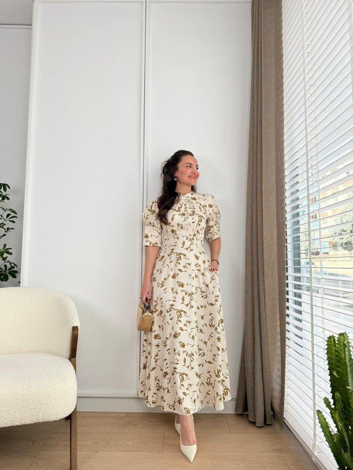 Ekru Yakası Bağlama Detaylı Elbise