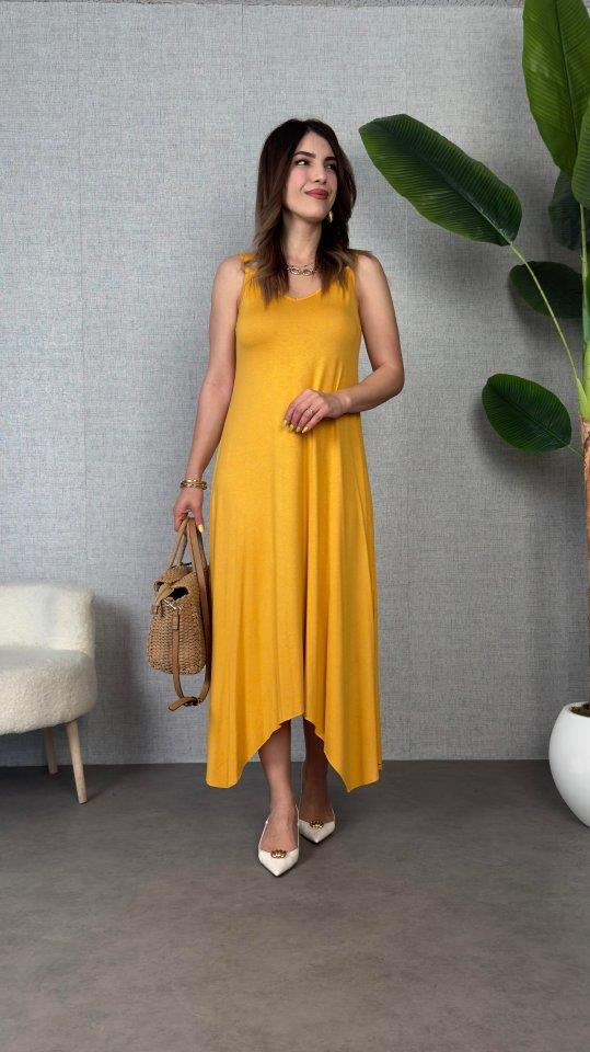 Kadın çan Dokuma Kumaş V Yaka Asimetrik Kesim Elbise