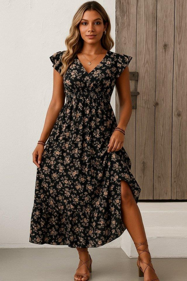 Kadın Kısa Kollu Kruvaze Yaka Beli Lastikli çiçek Desenli Elbise