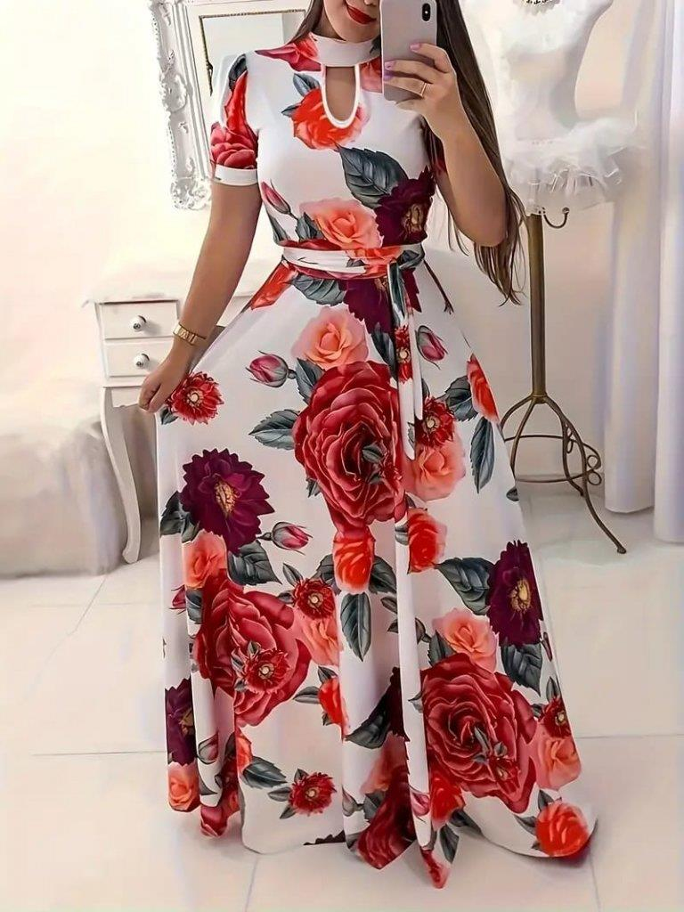 Kadın Kısa Kollu Pencere Detay Gül Baskılı Tam Boy Kiloş Elbise