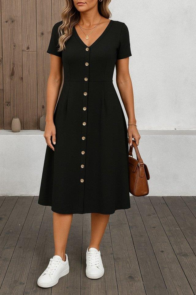 Kadın Kısa Kollu V Yakalı önden Düğmeli A Kesim Dokuma Elbise