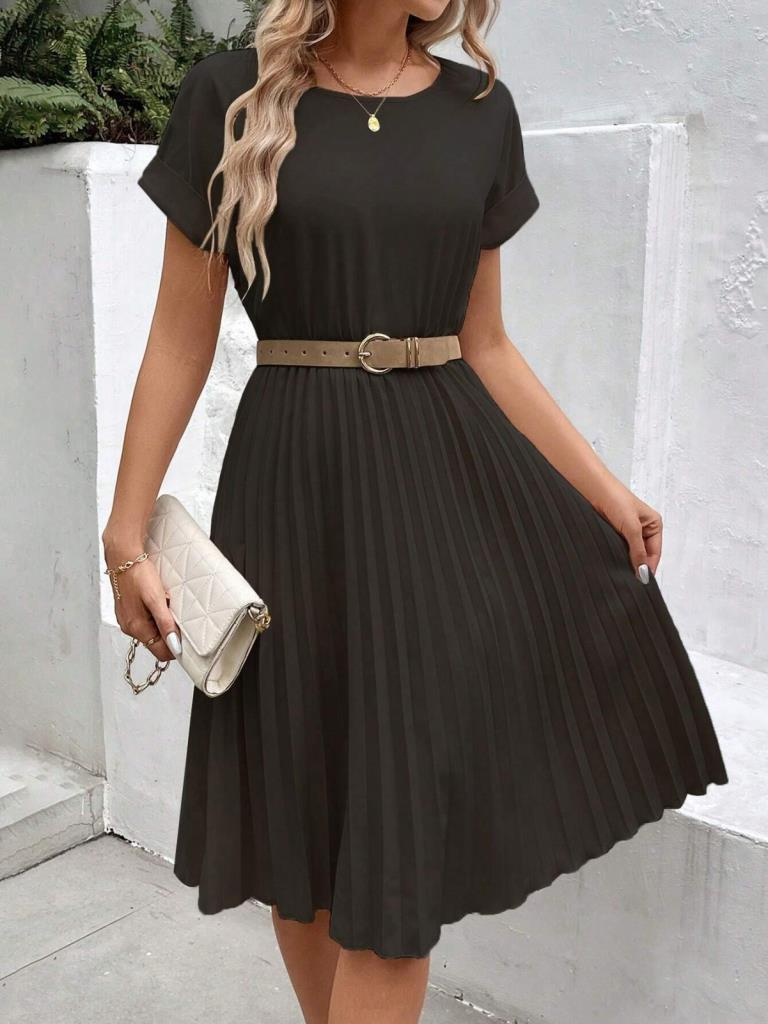 Kadın Kısa Kollu Yakası Açık Belden Lastikli Pileli Kısa Ithal Krep Elbise
