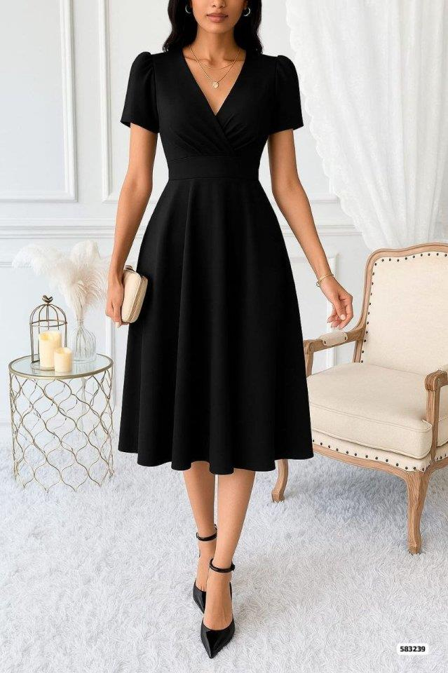 Kadın Kruvaze Yaka Kısa Kollu Midi Boy Krep Kumaş Elbise