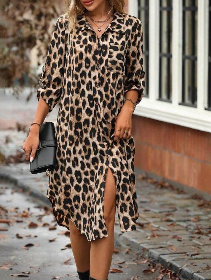 Kadın Leopar Desenli Cep Detay Kolu Manşetli Moskrep Gömlek Elbise