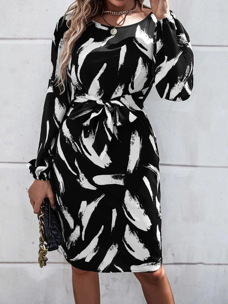Kadın Uzun Kollu Bel Bağlama Detay Krep Elbise