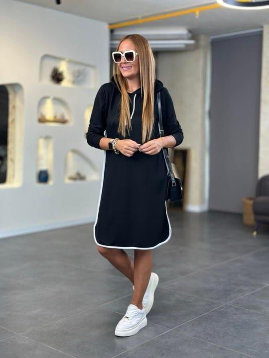 Kadın Uzun Kollu Kapüşon Ve Ribana Detay Diz üstü Elbise