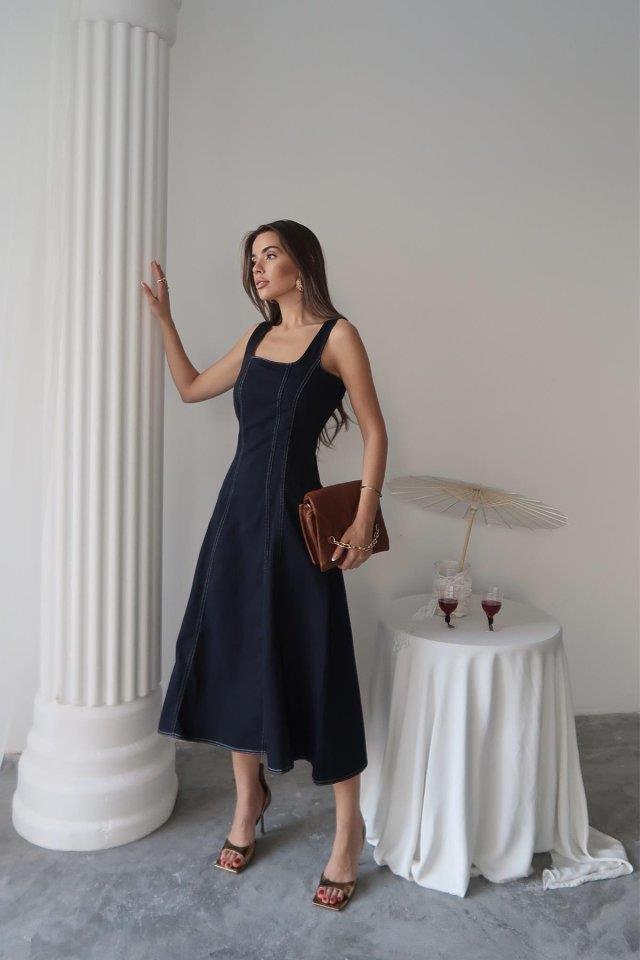 Lacivert Çift Dikişli Gabardin Elbise