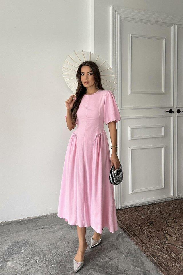 Pembe Arkadan Bağlamalı Büzgülü Keten Elbise