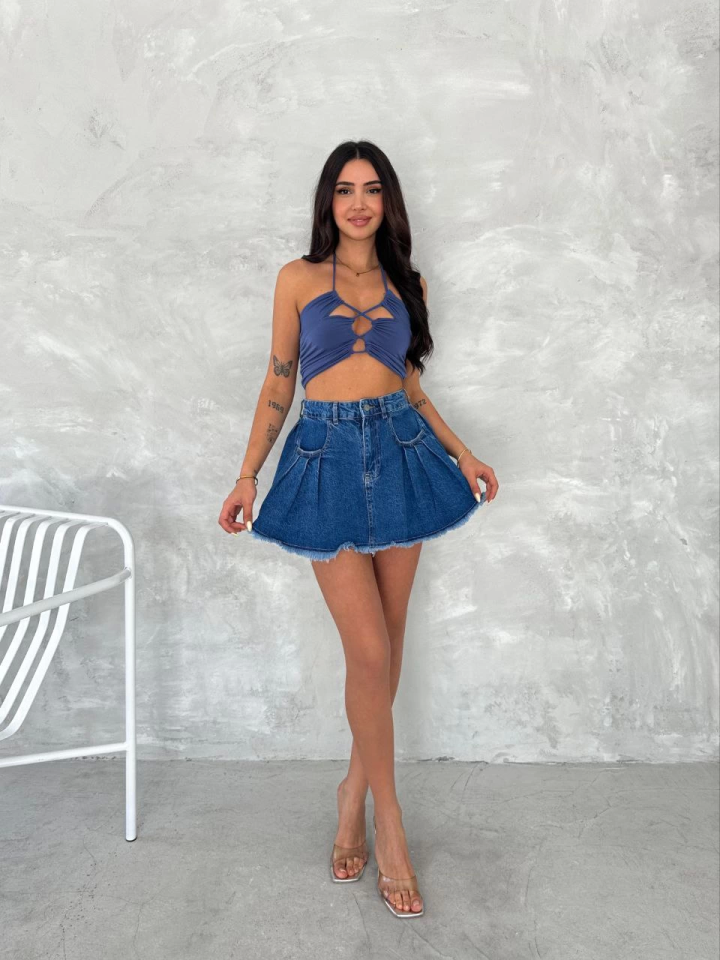 Şık Pileli Yazlık Mini Etekli Kot- Saks Mavisi
