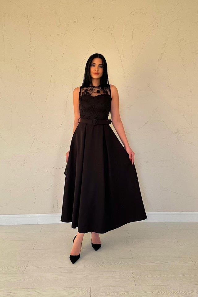 Siyah Önü Dantel Detaylı Kemerli Elbise