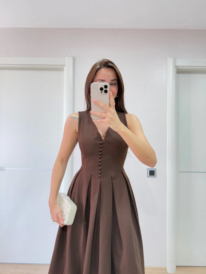 V Yaka Uzun Kolsuz Elbise- Kahverengi